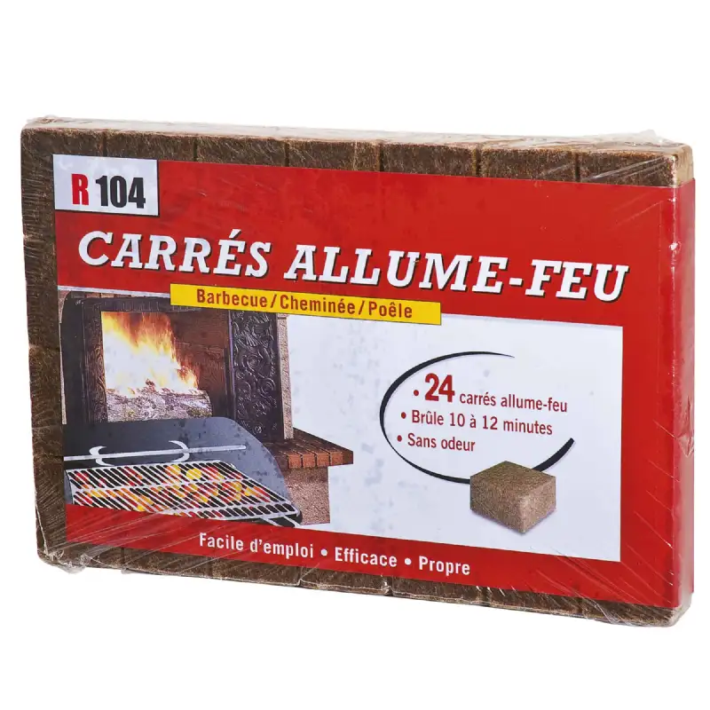 Le carré Allume-Feu R104 est idéal pour démarrer tous feux ouverts, barbecue, cheminée, poêle à charbon, et feux de camp.