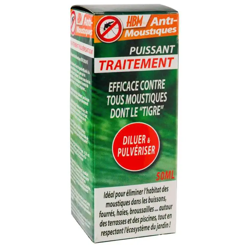 Anti moustique traitement pulvérisation. Efficace contre tous les moustiques. Contenant : 50 ml. Utiliser avec un pulvérisateur. 1 litre de mélange (eau + traitement) permet de traiter 15 m².