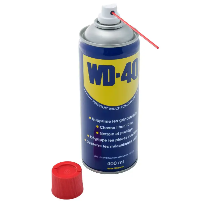 La bombe dégrippant 400 ml de la marque WD-40 lubrifie, chasse l'humidité, nettoie, dégrippe et protège les surfaces métalliques de l’humidité de la rouille et autres éléments corrosifs.