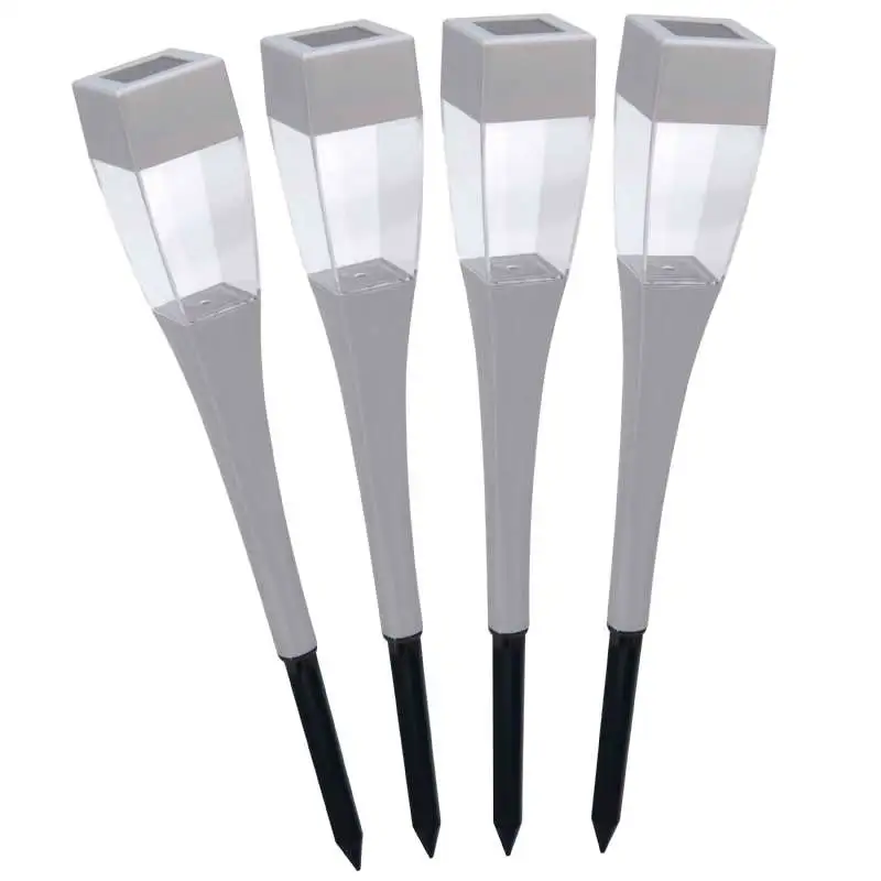 Bornes solaires carrées 4,5 x 4,5 cm 4 pièces. Fonctionne avec 1 Led blanche. Elle est autonome, sans fil, sans pile, écologique et économique. Hauteur 38 cm.