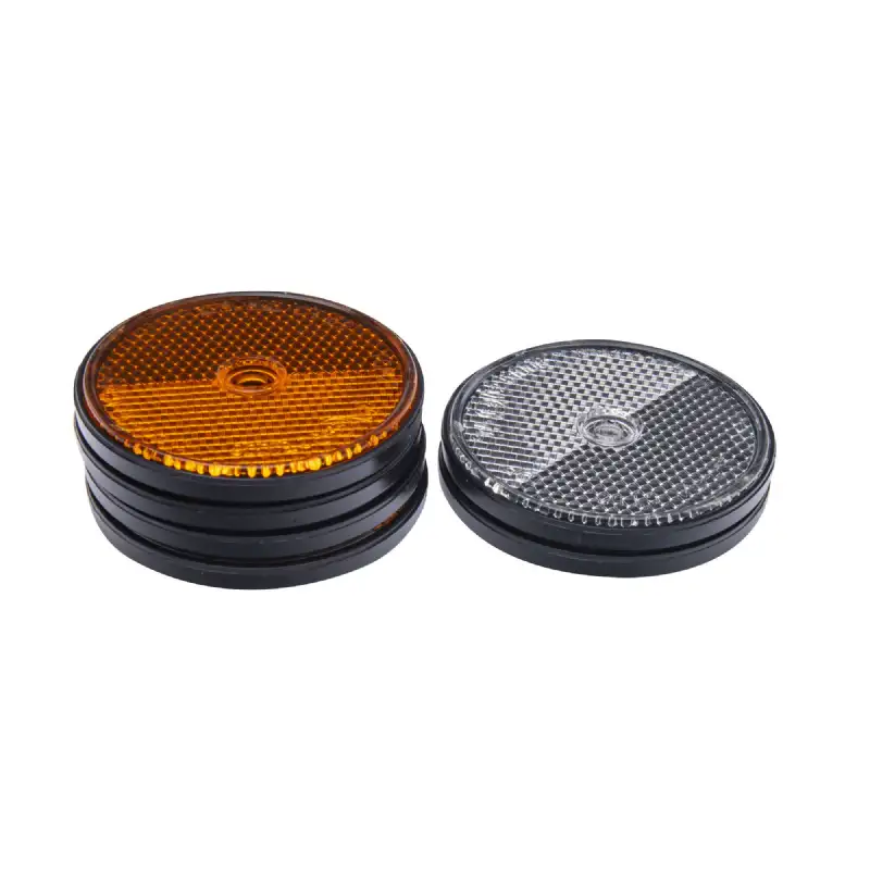 Catadioptre circulaire orange et blanc à coller ou fixer par vis. Utile pour remorque, vélo, auto, moto pour une meilleur sécurité la nuit ou au crépuscule.