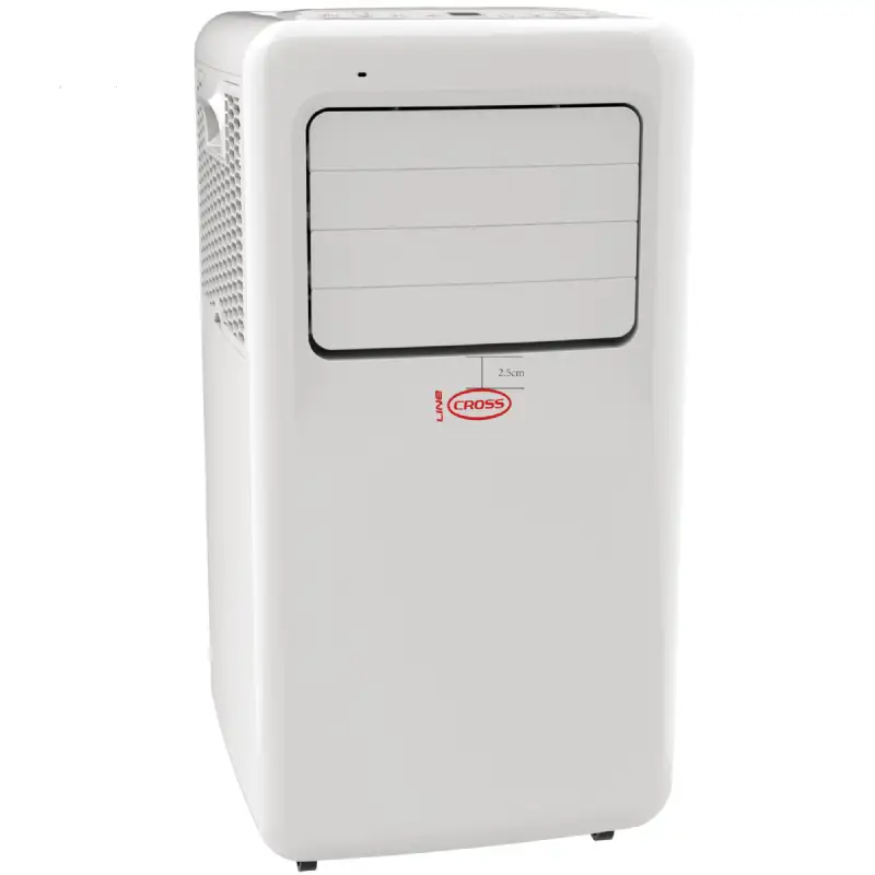Climatiseur portable 9000 BTU/H – 2600 W. Utilisable comme ventilateur, refroidisseur et déshumidificateur. Fourni avec télécommande. Consommation : 950 watts. Volume d’air traité : 380 m³/h. 2 vitesses de ventilation. Plage de fonctionnement : 15-43°C. Minuterie programmable : 24 heures. Mode veille. Inclus kit adaptateur fenêtre pour tuyau d’évacuation d’air chaud et utilisable avec des fenêtres ou portes coulissantes de 150 cm max. Alarme de remplissage du réservoir d'eau.
