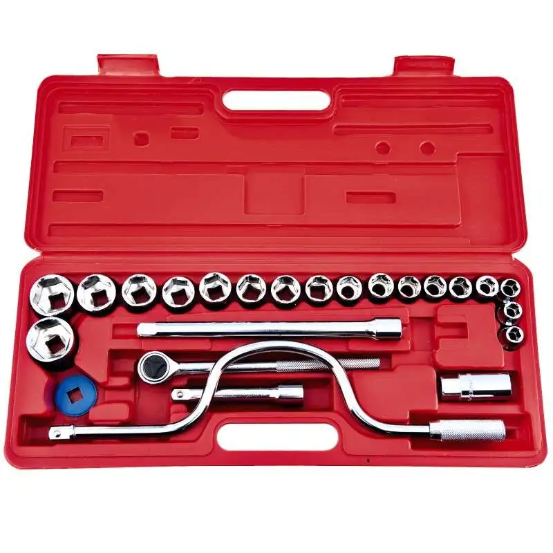 Coffret comprenant 24 pièces dont 18 douilles à 6 pans, 3 embouts métal, 1 poignée, 1 embout à cliquet, 1 embout plastique. Résiste à la rouille