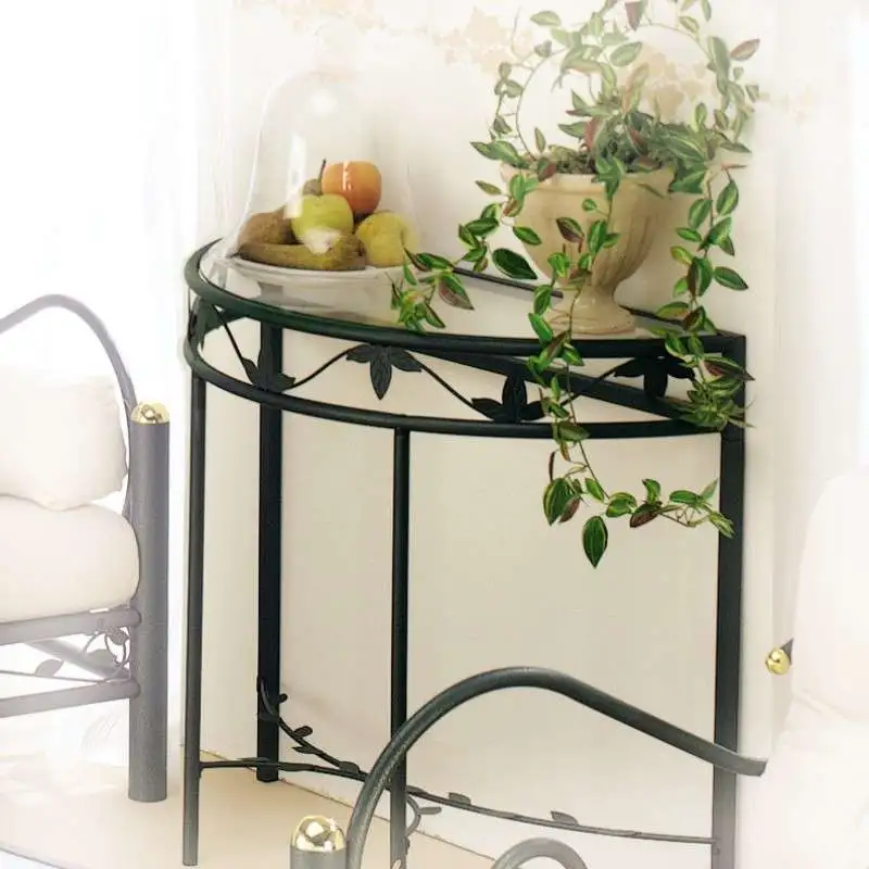Console demi-lune avec dessus en verre. Dimensions : L: 85 x P: 37 x H: 72 cm.