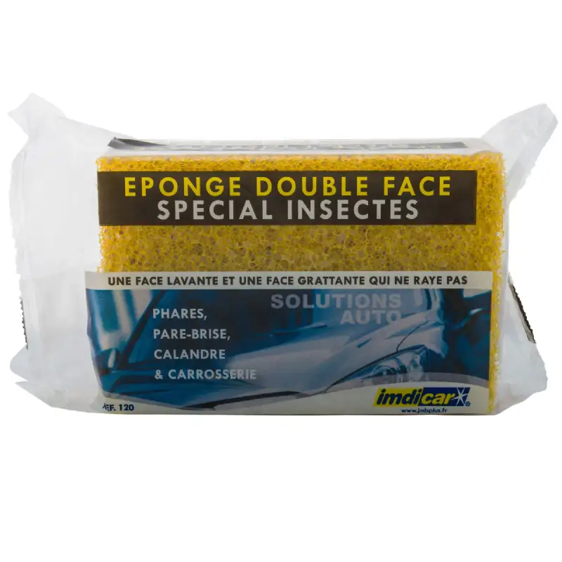 L'éponge est double face. Elle possède une face lavante et une face grattante qui ne raye pas et qui permet de retirer les insectes collés sur les phares, le pare-brise, la calandre et la carrosserie de votre voiture.