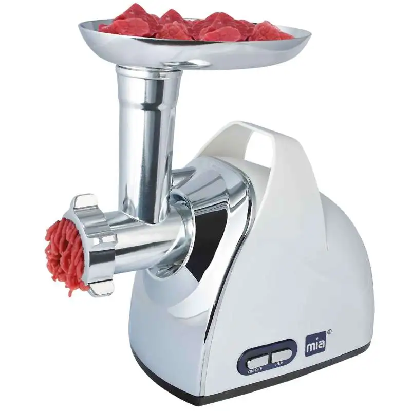 Ce hachoir à viande multifonctions 2 en 1 avec robot à pâtisserie peut hacher jusqu'à 1.3 kg/min de viande. Il rend le travail efficace et rapide grâce à son large plateau collecteur avec poussoir, son système anti bourrage ainsi que sa fonction inverseur de rotation. Mise en marche avec un interrupteur ON / OFF, la puissance de son moteur est de 1200 watts. Le moteur est donc performant. Il est composé d'une partie antérieur chromée et un habitacle de couleur blanche et est en métal. Il possède également une poignée pratique. Cet appareil est livré avec :
