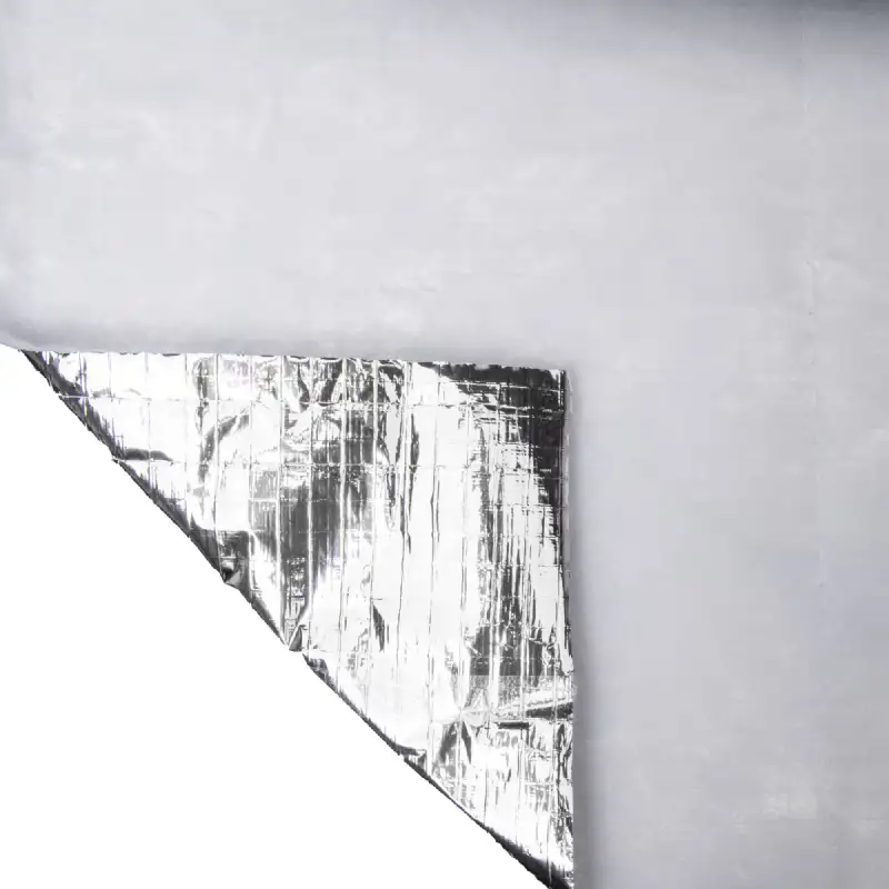 - Composition : 1 film polyester métallisé armé de 60 g/m² + 1 ouate polyester de fibre de 80 g/m²