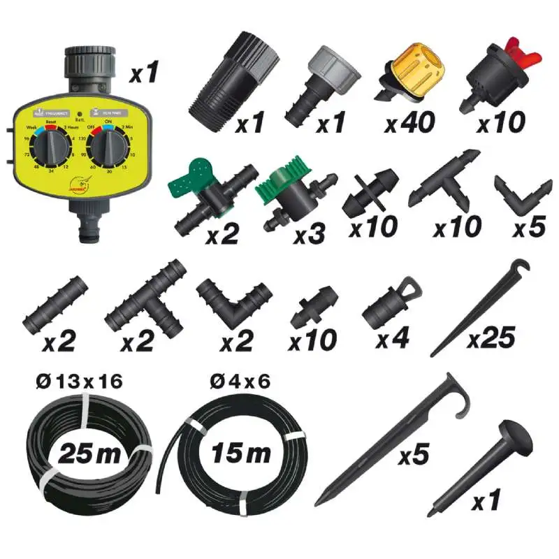 Kit complet pour Jardin et Terrasse de la marque Jardibric. Contient 25 mètres de tuyau de diamètre 16 mm, 15 mètres de tuyau de diamètre 6 mm ainsi que l'essentiel des pièces et outils nécessaires pour un arrosage complet et précis. Idéal pour tout type de jardin et terrasse.