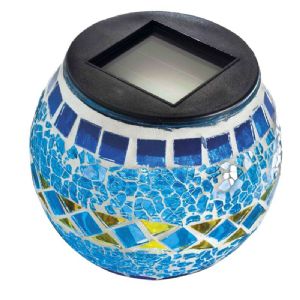Lanterne solaire décorative en mosaïque avec éclairage LED blanc rechargeable par la lumière du soleil. Ces lanternes solaires s'allument automatiquement au crépuscule.Modèle rond. Dimension 115mm.