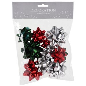 12 Noeuds décoration assortis de la marque Koopman, coloris rouge / vert / argent pour faire de vos cadeaux de Noël de véritables petits bijoux !