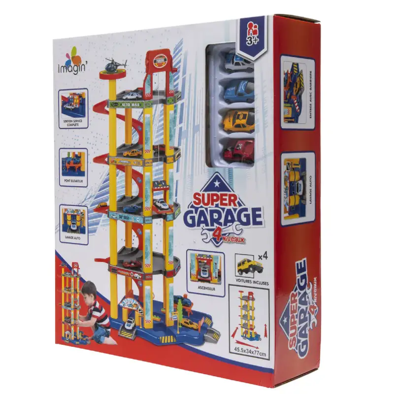 Ce parking station de lavage à étage de la marque Imagin offrira à votre enfant la possibilité de jouer avec parking station de lavage qui dispose de 4 étages, un ascenseur, un pont élévateur ainsi que ses 4 petites voitures ! Pour les enfants à partir de 3 ans.