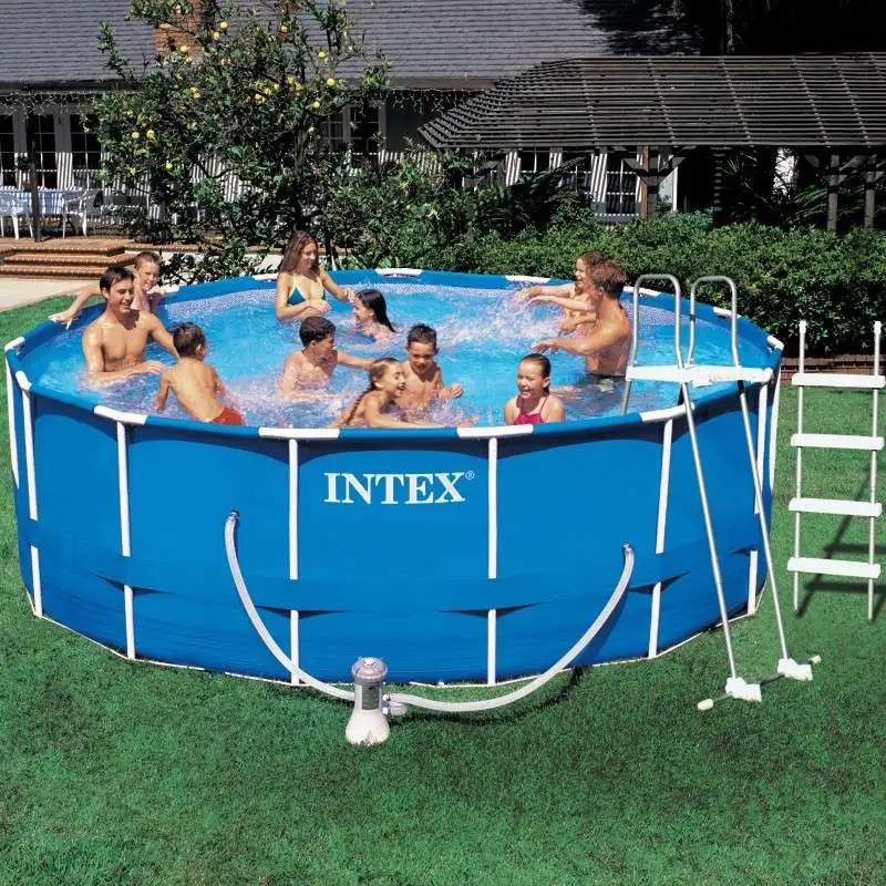 Piscines tubulaires métal de forme ovale en kit équipées d’un système de filtration par pompe filtrante avec épurateur à cartouche.