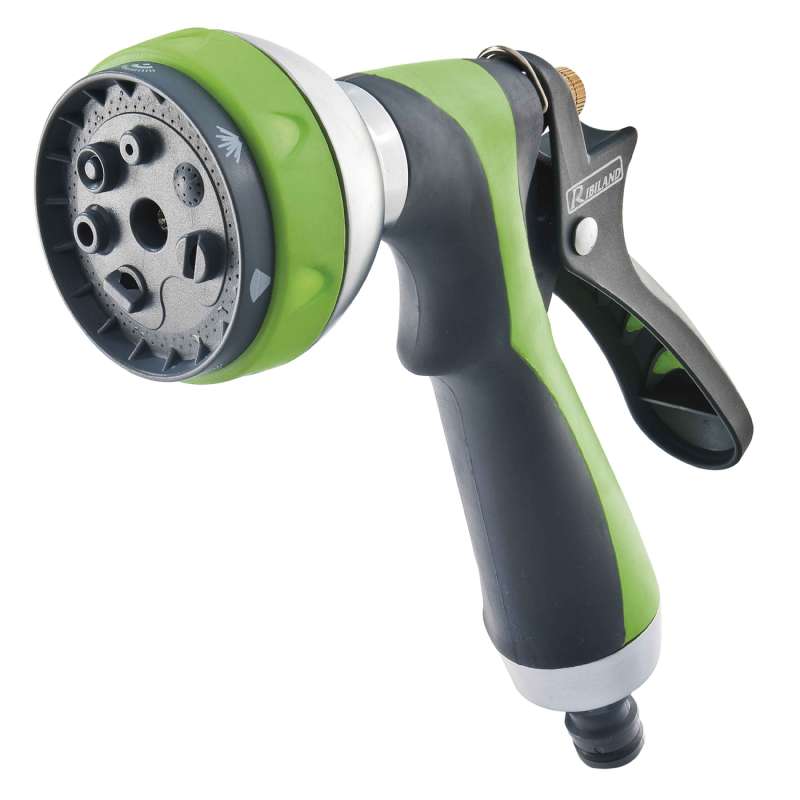 Pistolet d'arrosage bi-matière 7 jets. Métal et caoutchouc avec raccord automatique.