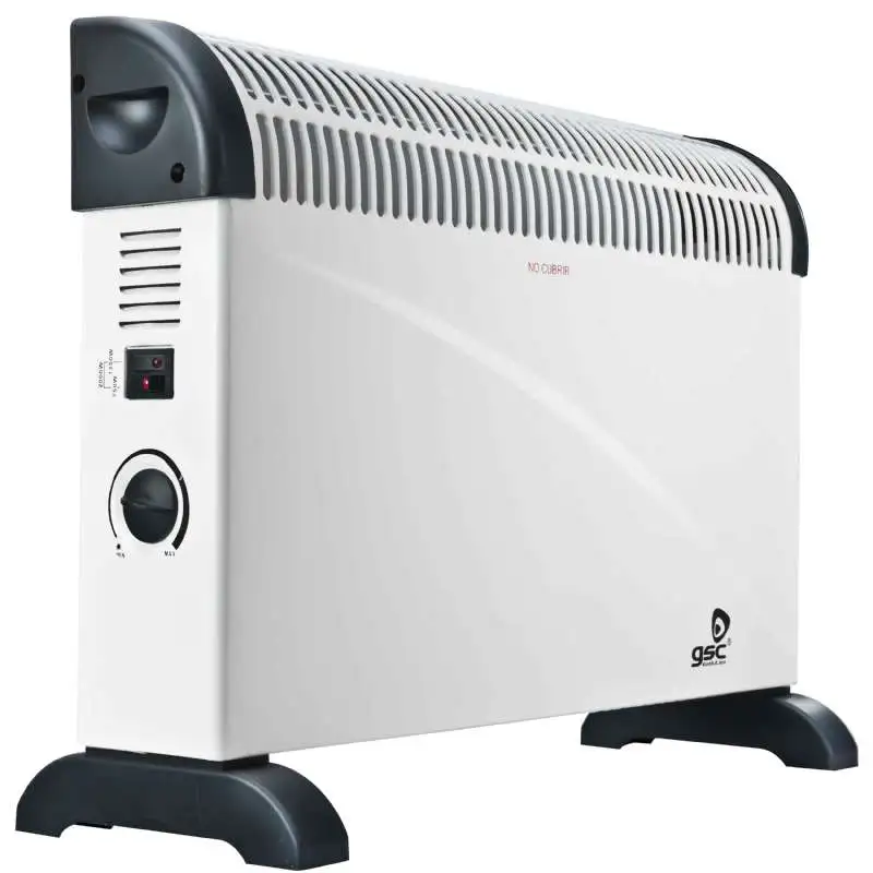 Radiateur électrique 2000 w. 2 niveaux grâce à 2 interrupteurs + interrupteur ON / OFF indépendant. Grille de protection et thermostat anti-surchauffe et à température réglable. Câble: 1.5 m. Dimensions: 420 x 565 mm.
