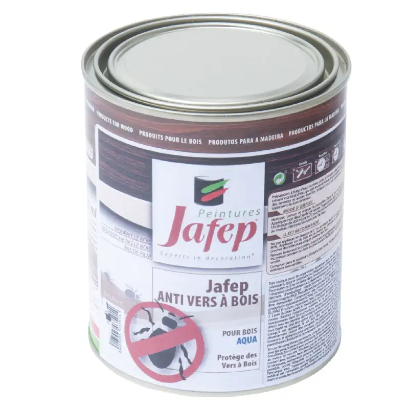 Le traitement insecticide du bois Jafep (750ml) est une préparation à base d'eau, incolore, prête à l'emploi, adaptée aux peintures à base de solvants qui agit en profondeur dans le bois pour prévenir de l'apparition des vers à bois, des termites et autres insectes.